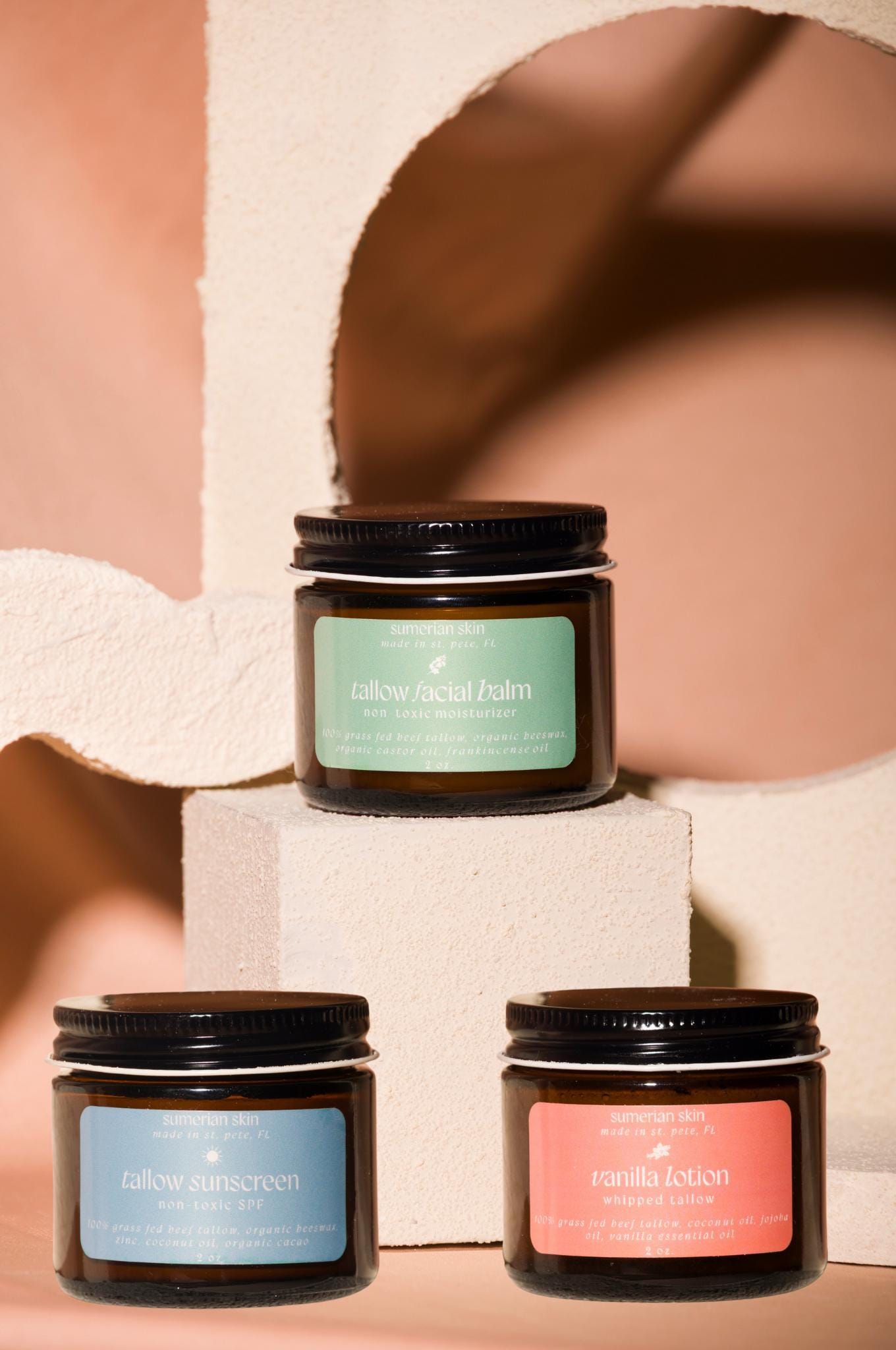 This is a great opportunity to try all of the products Sumerian Skin has to offer! This bundle includes 2oz Whipped Tallow (unscented or scent of choice), 2oz facial balm, and 2oz SPF.